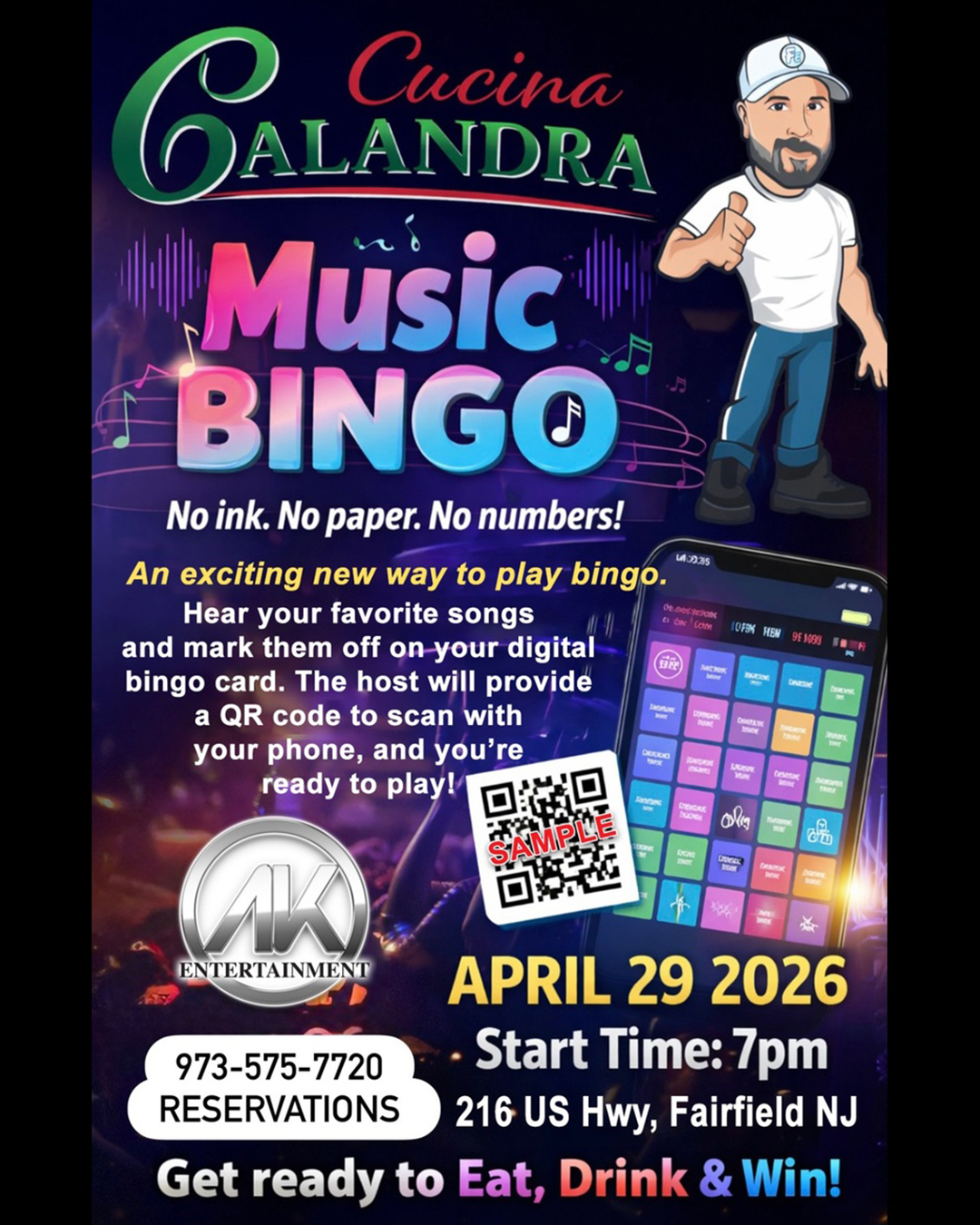 Hear your favorite songs and mark them off on your digital bingo card. The host will provide a QR code to scan with your phone, and you’re ready to play!